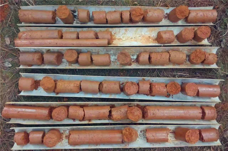 鉆進過程中提升和給進是依靠手搖卷揚裝置配套提引器或加壓手輪通過鏈輪鏈條來完成,大大提高了鉆機提升和加壓力。鉆進過程中,利用泥漿泵冷卻回轉(zhuǎn)器和鉆頭,并攜帶土巖屑返回地表。隨著鉆具向地下延伸,所需要的土巖樣不斷進入到巖心管內(nèi),當(dāng)土巖樣達到預(yù)定深度后,便可以將鉆桿取出,實現(xiàn)了單回次取樣作業(yè)。重復(fù)以上步驟,直至全孔取樣完成。