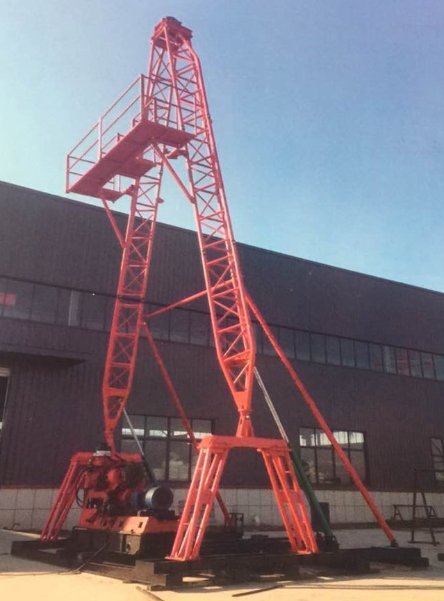 AY-13型鉆塔可配套各種水井鉆機和XY系列巖心鉆機垂直、斜孔的施工。其特點為設計除具有承載能力較大、結(jié)構合理、液壓起塔安全可靠,拆裝、搬運成本低等特點外,最顯著特點一是塔腳跨度大(5米),操作鉆機空間大;二是塔身下塔腿連接鉸鏈高于底座底梁2.3米,從而在鉆機左右擺放時下塔腿不影響鉆機前后移車,鉆機動力部分可移至腿支撐內(nèi)襠中。也使得斜孔鉆進和提鉆過程中天車、回轉(zhuǎn)、井孔達到三點一線,大大提高了定向井孔施工的精準度及安全。